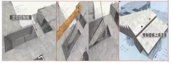 放线,根据定位轴线放出预制楼梯梯段定位,预制楼梯上端注浆。