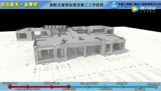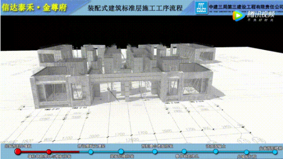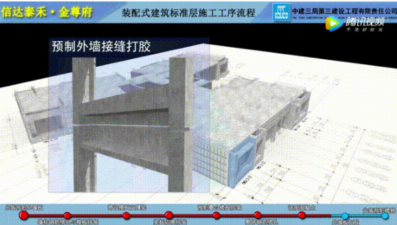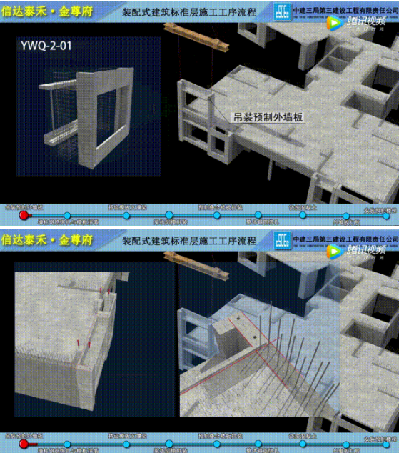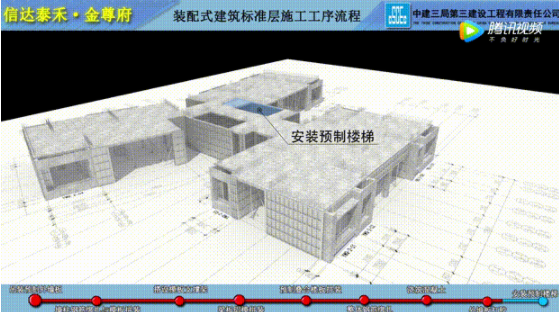 通过BIM软件创建结构、建筑、爬架等三维信息模型,运用施工模拟从吊装预制外墙板、墙柱钢筋绑扎、铝合金墙柱模板拼装、搭设楼板满堂支撑架、非叠合楼板梁板模板拼装、预制叠合楼板拼装、现浇梁板钢筋绑扎、楼板浇筑混凝土、安装预制楼梯,完成后楼梯上端灌浆、外墙板打胶等10个施工工序进行施工模拟,对施工过程进行全过程的施工模拟、全方位的施工指导。