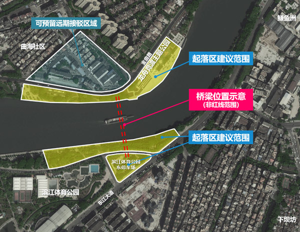 迎宾慢行桥规划研究范围Scope of Planning Research of Yingbin Pedestrian Bridge2)概念设计范围 Scope of Conceptual Design方案设计应包括桥梁方案设计及桥梁起落区域的节点空间设计。图中桥梁位置及起落区范围均为示意范围(非红线范围),具体桥梁位置、平面线形、起落点位置需结合周边用地条件、河道通航、防洪等要求统筹考虑并提出建议,桥梁平面线形无限制。The design should include schematic design of the bridge and space design of the nodes in bridge approaching area. The position and the range of approaching area of the bridge shown in the above figure are all schematic range (not within the range of the red lines). The specific position, plane lines and position of approaching points should be considered and proposed based on the requirements on surrounding land conditions, watercourse navigation and flood control. There is no limitation on the plane lines of the bridge.桥梁方案设计应处理好近远期的协调和接驳,一是对近期可实施的起落区提出详细方案,二是对与周边腹地的远期接驳提出技术解决方案。其中,近期可实施的起落区区域为南岸滨江体育公园段滨水岸线、北岸滨水岸线及万江龙舟竞渡主题公园;远期接驳区域为南岸滨江体育公园停车场用地、北岸曲海社区地块。The bridge design should properly deal with the coordination and connection in the near- and long-term. One is to put forward a detailed plan for the approaching area that is implementable in the near term, and the other is to put forward a technical solution for the long-term connection with the surrounding backland. Among other things, the implementable approaching areas in the near term are the south Riverside Sports Park section, the north waterfront and Wanjiang Dragon Boat Race Theme Park; the long-term connection areas are the parking lot of the south Riverside Sports Park and Quhai Community plot in the north waterfront.