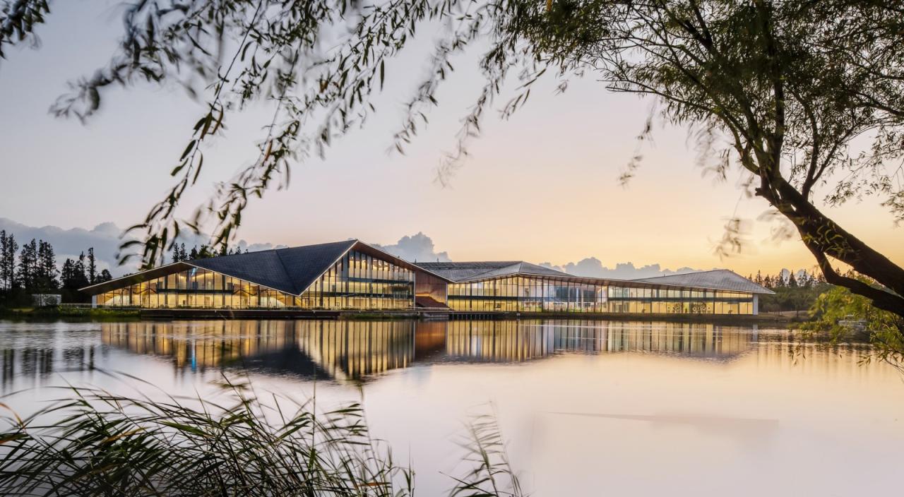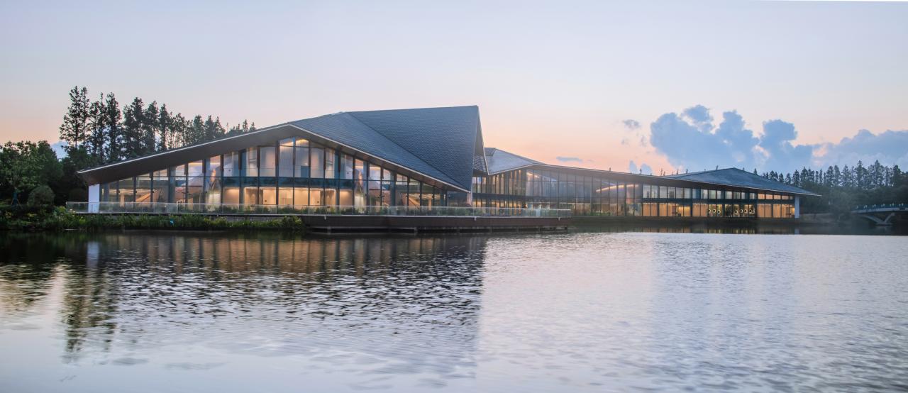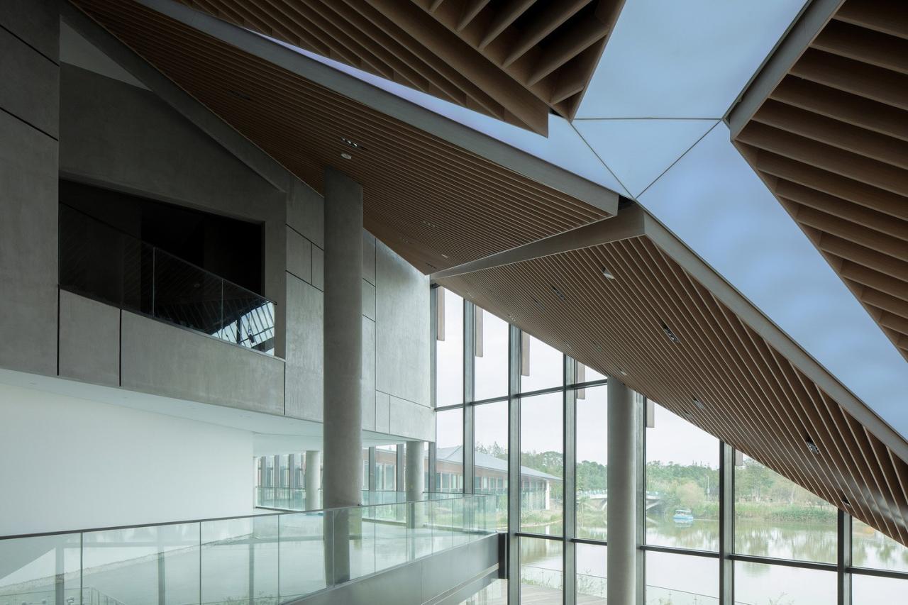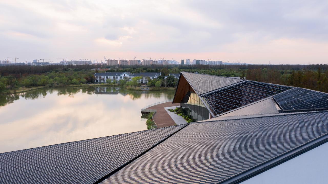 02山峦般起伏的屋顶基于场所精神,我们希望设计中植入专属于崇明的记忆,那是有关海岛、船篷还有村落的记忆。我们用一个山峦般连绵起伏的大屋顶勾勒出与自然相融的天际线,再通过一个连续通透的界面让美丽的的花溪湖景渗透到内部空间,框景出一副徐徐展开的中式山水长卷。
