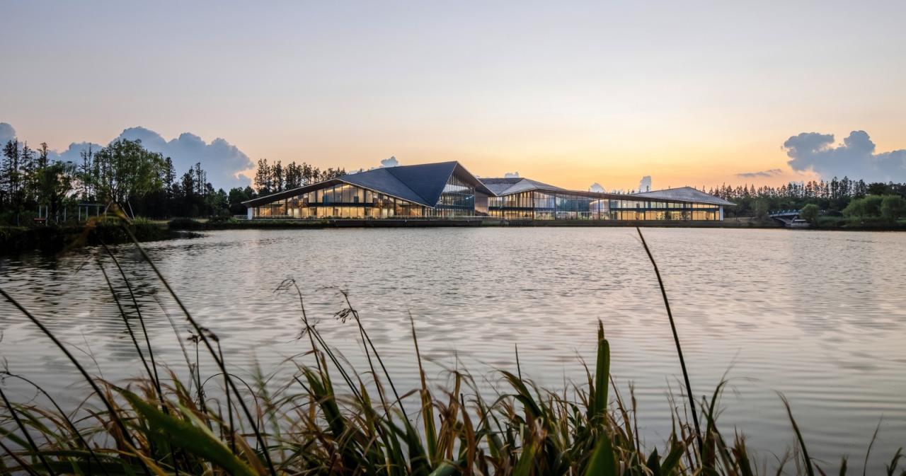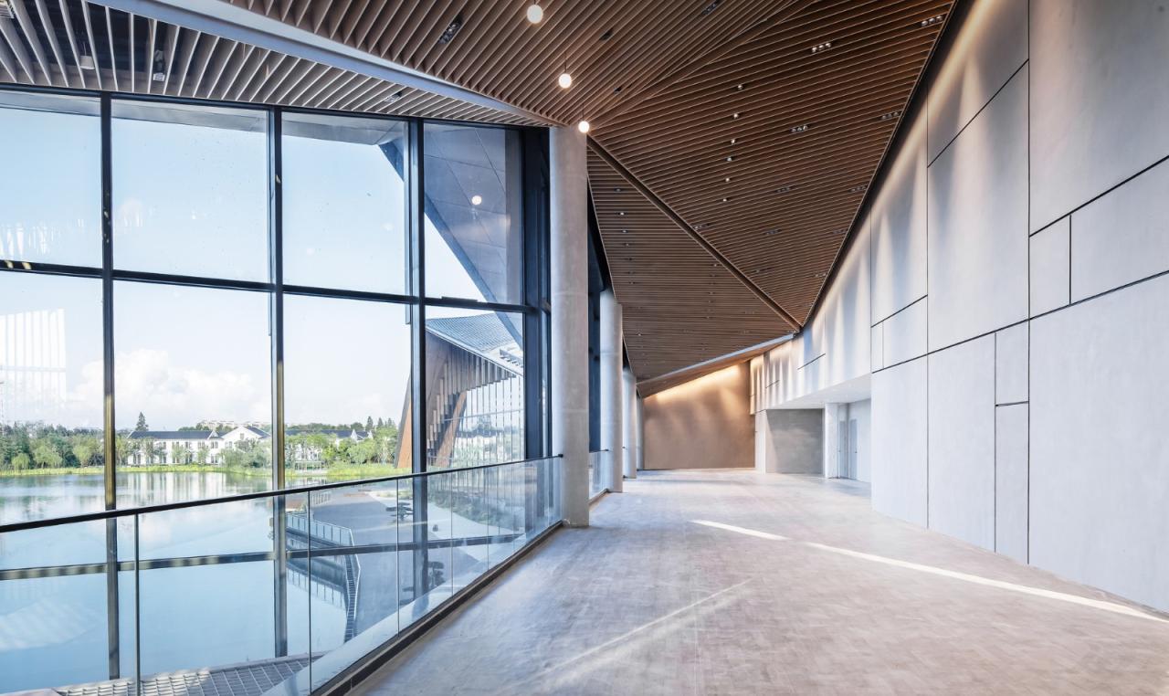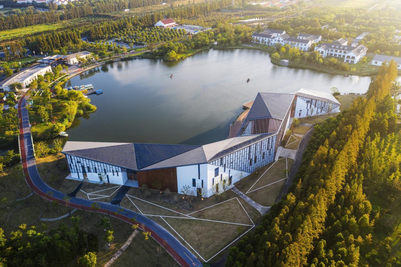 02山峦般起伏的屋顶基于场所精神,我们希望设计中植入专属于崇明的记忆,那是有关海岛、船篷还有村落的记忆。我们用一个山峦般连绵起伏的大屋顶勾勒出与自然相融的天际线,再通过一个连续通透的界面让美丽的的花溪湖景渗透到内部空间,框景出一副徐徐展开的中式山水长卷。