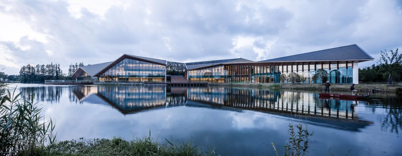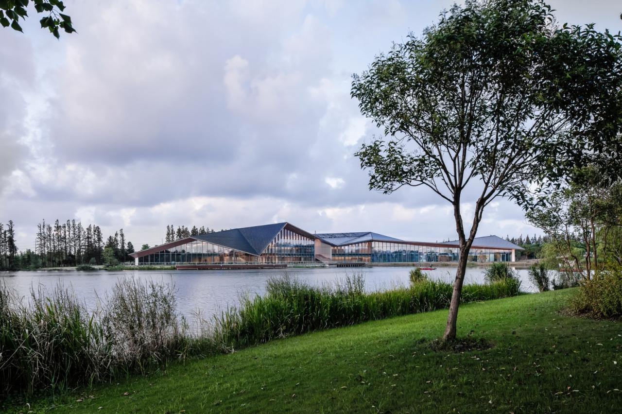 01自然野趣的场所长兴郊野公园是一座以“自然、生态、野趣”为特色的远郊生态涵养型郊野公园。项目位于长兴岛郊野公园花溪湖畔北侧,与公园的主入口隔湖相望,被一片高大茂密的水杉林环绕。该项目旨在为这片充满优质生态资源和归田野趣的郊野公园赋予一系列新的功能空间,在满足游客服务功能的同时成为整个公园新的激活点和展示“窗口”。S型的狭长基地轮廓为设计带来不小的挑战,而将近180米的沿湖景观带又为设计创造了很好的机遇。我们尝试以一种顺应场所条件的方式来介入设计,希望整个建筑以相对轻松和自由的姿态融入环境。