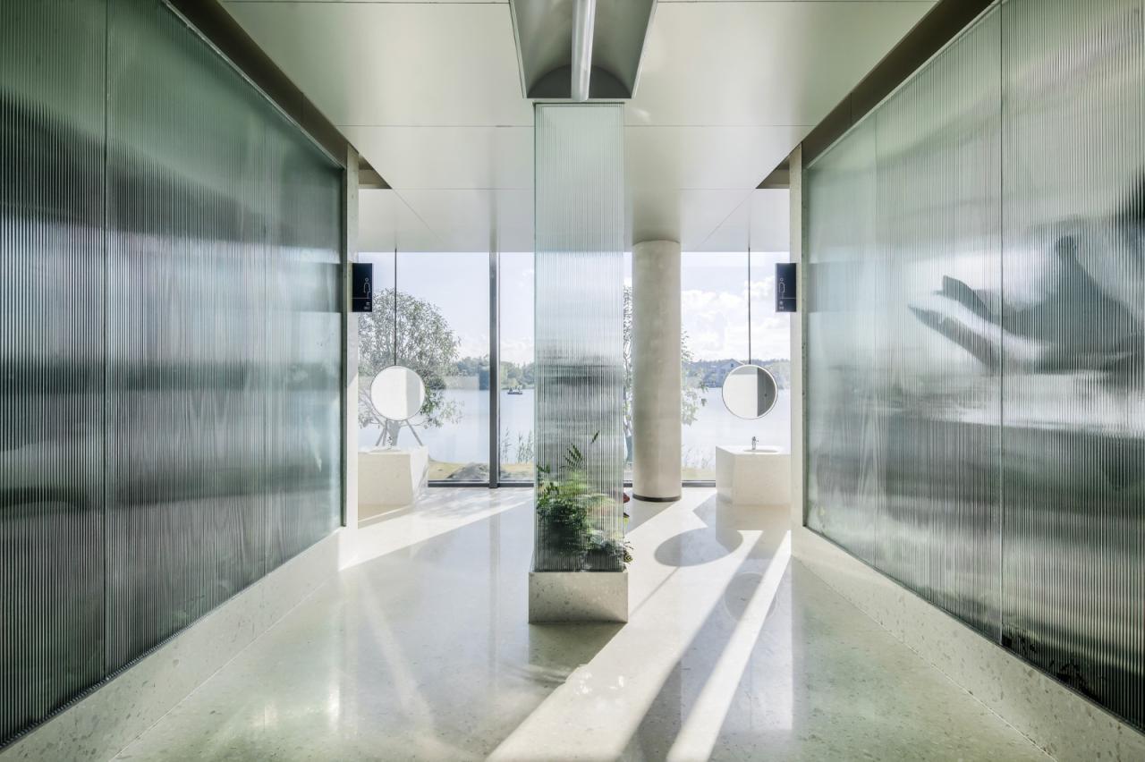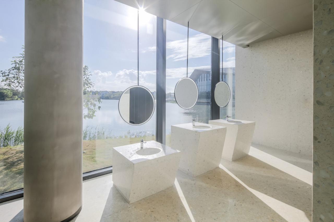 04全景式的游客卫生间一个游客中心是否具备足够的人文关怀,往往体现在对待卫生间的设计上。作为面向整个郊野公园使用的AAA级标准卫生间,我们打破常规将其放在景观最好的南侧沿湖面,并依景观面展开布置。为了给游客带来更好的使用体验,我们将男女卫生间的洗手台放置在面向景观的明亮的落地玻璃窗前,让游客在镜前梳洗整理时可以同时欣赏到美丽的湖景。我们又将绿植元素加入到隔墙的设计中,让郊野公园独特的野趣引入室内空间。