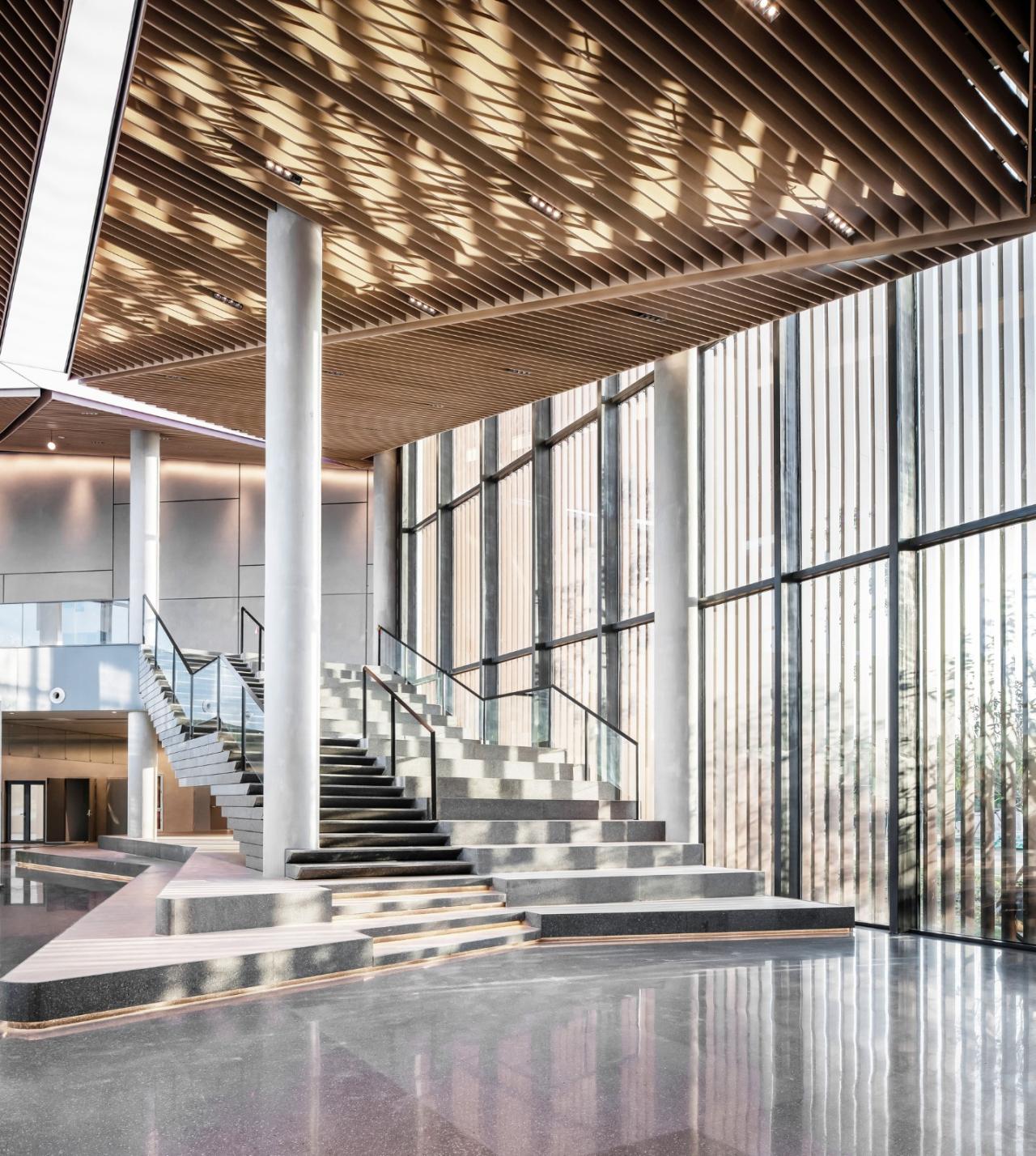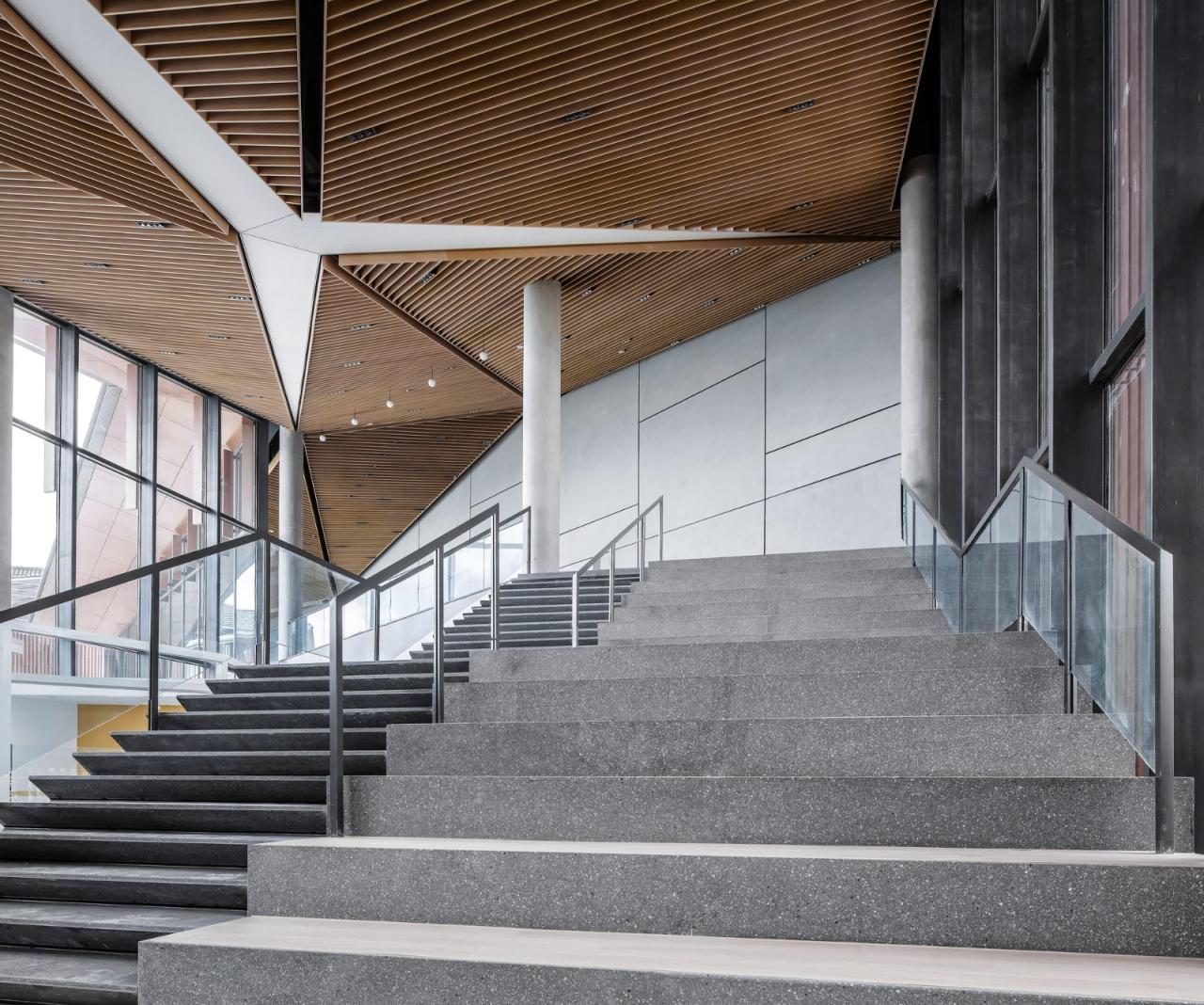 游客中心东侧的二号楼以游客服务功能为主,包括游客接待大厅、休息区、文创特产展销区和快餐服务区。我们在展销区临近主入口的西侧设计了一个可以用作路演、发布或展览的大台阶——它既是连接上下空间的竖向交通,又能为集聚性的活动提供空间场所。楼梯以三角形为母题,通过一系列的转折和组合,大阶梯、踏步以及底部平台,以更大的体积存在感呼应了此处高挑开阔的建筑空间,共同生成了充满张力和力量感的立体雕塑,提供了可穿行及停驻的公共性交通空间。我们希望游客可以在此展开一系列的使用场景,突破传统公共空间重楼梯只是组织交通的功能属性,真正成为具备多功能复合性及凝聚力的重要场所。
