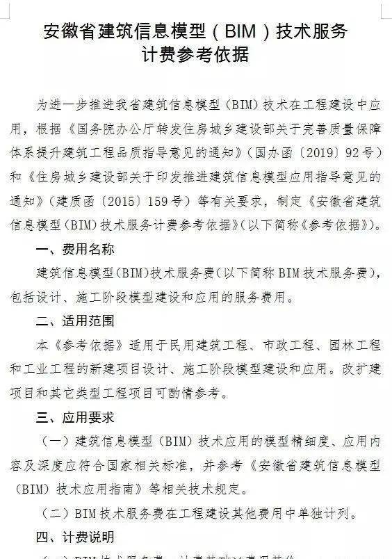 2、安徽省住建厅印发了关于《安徽省建筑信息模型(BIM)技术服务计费参考依据》