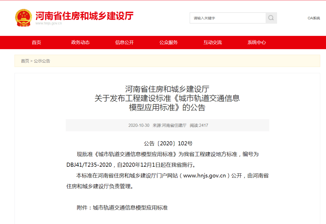 9、河南省住建厅发布《城市轨道交通信息模型应用标准》