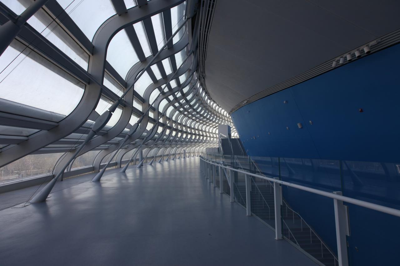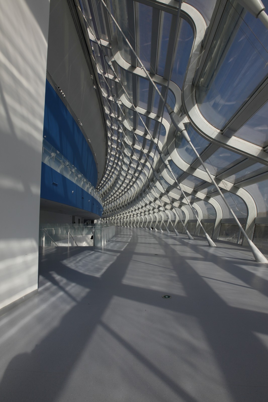 这一元素引导着设计团队大胆地将快速旋转‘冰陀螺’游戏的概念延伸、演化,从而在立面上创造了22条旋转光带。也因此,这些‘丝带’不仅仅代表了冰面和速滑赛道,同时也完美地呈现了速滑选手们的超级速度。