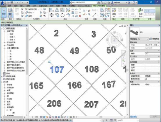 由于吊顶模型是利用Rhino软件创建,所以使用基于Revit的施工管理平台进行施工管理时,需要将Rhino模型导入Revit软件中,但是Rhino模型导入到Revit中是以“体量模型”的形式存在。在吊顶工程施工中,为便于对单元面板进行排布吊装,可以对其进行分区域编号。为实现在Revit中对问题信息的定位,可以通过在Revit软件中创建“基于面的常规模型”族,对单元面板进行编号标注,部分进行编号标注的单元面板如图9所示。