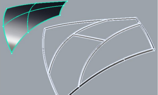 对于曲面板块的下料问题,可使用单元板块三维模型计算。采用非均匀有理B样条插值进行每个单元板块模型的构建计算,因球节点安装数据偏差,分割线在平面段不顺直,在曲面段不光滑,通过在模型中进行非均匀有理B样条插值计算,对每块单元铝板吊点XOY平面坐标进行微调,而后对曲面模型进行重新设计与分割,使得分割线条平段顺直,曲段光滑,如图6所示。