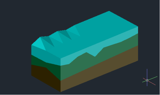 对于大规模的复杂地层,可利用Civil3D最新的曲面建模的方法。将每个地层的层顶标高和坐标分次导入生成多个曲面,再通过Civil3D自带工具从曲面提取实体,即为每层岩土层实体。其生成的模型实体可以进行布尔运算,进而模拟盾构开挖。该方法支持钻孔信息的批量导入,可快速建模。该方法的不足是导入只能通过DWG格式将三维实体导入其他BIM软件,因此会造成属性数据丢失。由于部分软件设置的原因,通过Civil3D建立的地质模型导入Revit等BIM软件后,常常会出现被线框包围,需对模型进行打断爆炸等操作后才能进行相关应用。使用Civil3D建立的分层地质模型如图1所示: