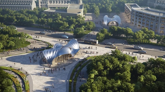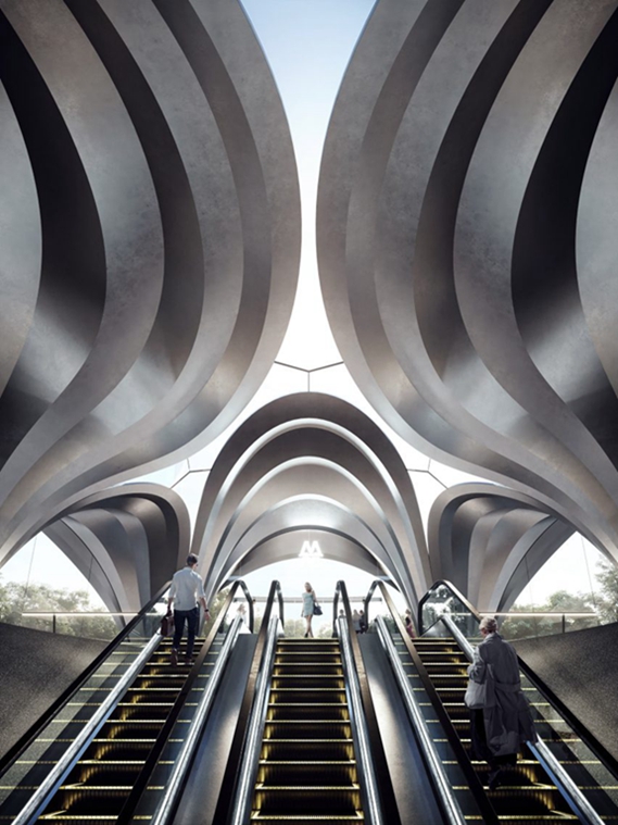视觉效果图显示,车站的入口是起伏的焊接钢模板,从新设计的景观公共广场上升起并拱起,这些广场旨在将入口亭作为地标。扎哈-哈迪德工作室表示:“德尼普罗市作为工程、冶金和制造业的卓越中心有着悠久的历史。这些丰富的传统在该市新地铁站的焊接钢入口亭中得到了呼应。”