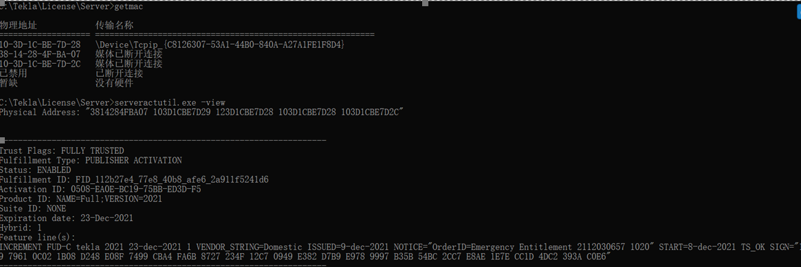 第一步:定位到lincense server文件夹,并输入getmac 和 serveractutil.exe-view命令,找到该电脑的物理地址和显示在此电脑上激活的license激活数量。