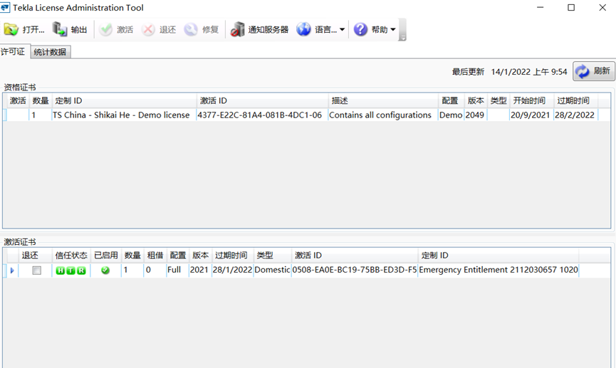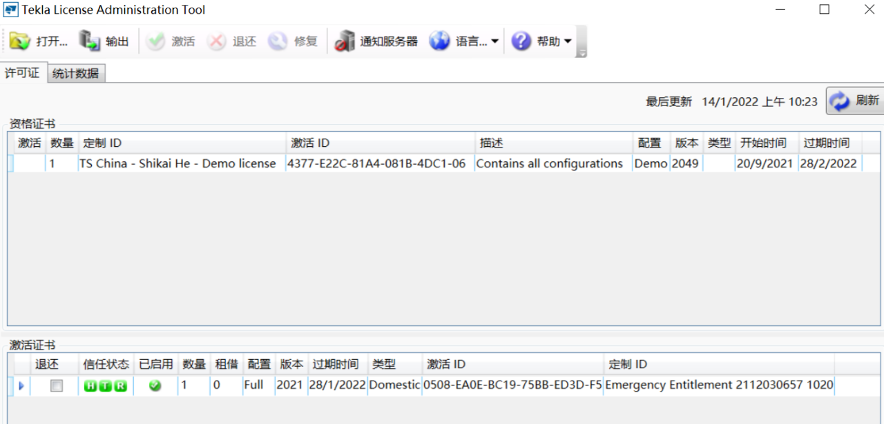 查看激活情况和统计数据,若显示已激活,且统计数据上显示的是类似下列的情况则说明许可证被正常激活,且服务器可用,即软件可以正常使用。