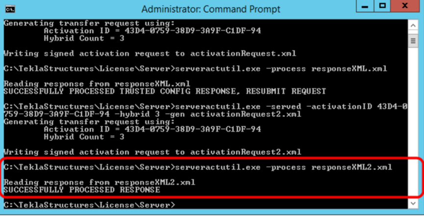 第四步:输入serveractutil.exe-process responseXML2.xml,此时界面将会出现SUCCESSFULLYPROCESSED RESPONSE,这就表示许可文件已激活;