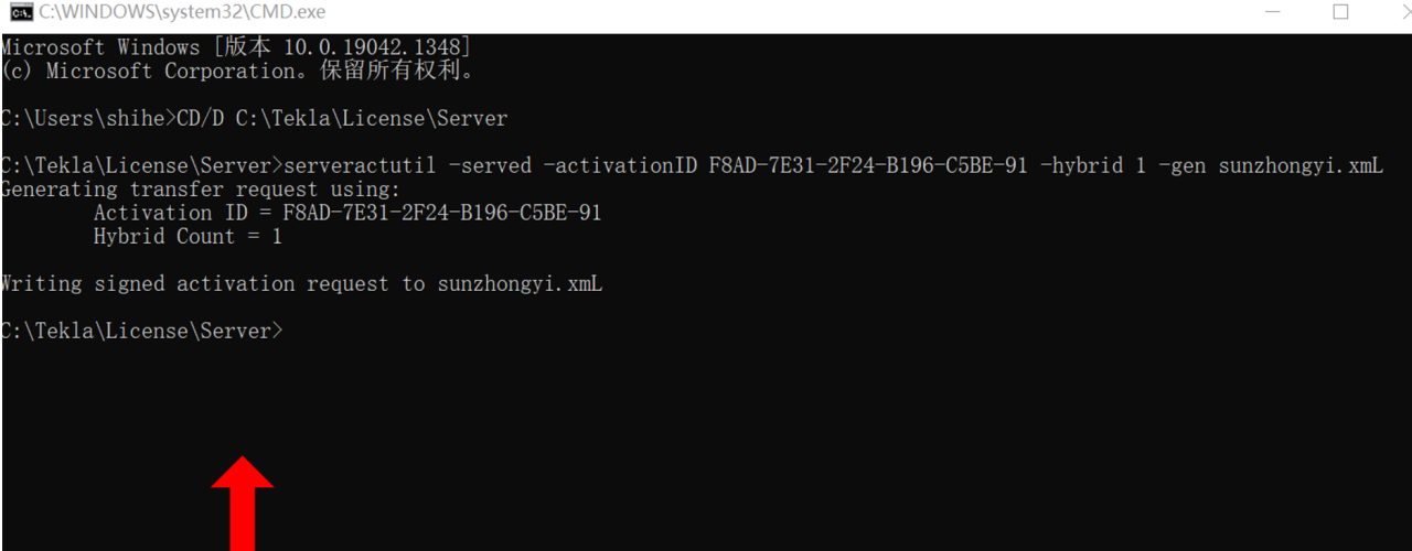 然后输入serveractutil-served -activationID 0508-EA0E-BC19-75BB-ED3D-XX(此ID根据每个公司或者人员不同有所不同,在各自的许可文件中查看)-hybrid 1(1这个说明激活的数量) -gen sunzhongyi.xmL