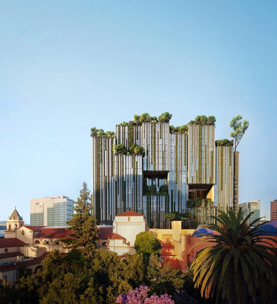 这个“门廊”将进行大量的景观美化。与建筑正面木质百叶窗相映成趣的装饰板条将悬挂在步行区上方,半封闭的后退花园也将采用这种装饰板条。“植物公园楼”将提供零售和办公空间,以及博物馆,并作为邻近的“科技互动楼”(Tech Interactive)的“扩展空间”,这是一个提供教育节目的科技中心。该建筑是零碳园区(Net Zero Campus)的一部分,这是该市与开发商西岸集团(Westbank)、城市社区(Urban Community)、必得胜(Peterson)和OPTrust公司共同发起的一项倡议,最终将在圣何塞园区建造六栋建筑。