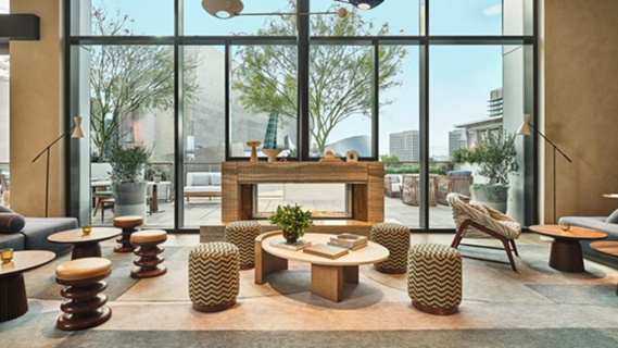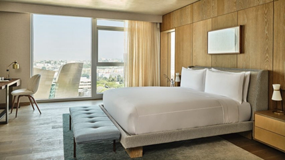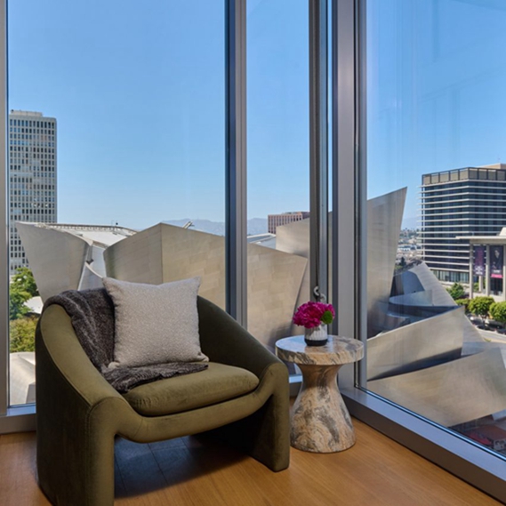 塔拉-伯纳德说:“我们称它更像是一个城市度假胜地,”伯纳德的设计目标是尊重盖里设计的高天花板和洞穴状“包皮”,同时给酒店一个人性化的尺寸。酒店拥有大量的石头、瓷砖和温暖的木材纹理,特别注意客房和公共区域,这些区域有窗户,可以眺望音乐厅和城市以外的地方。