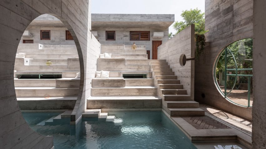 所有的房间都布置在酒店的一侧,并进行了多角度暴露,以产生交叉的微风,帮助室内降温。空间的中心是一个贯穿整个房产的泳池。这个空间的墙壁、地板和天花板都是由现浇混凝土制成的,具有洞穴般的品质。