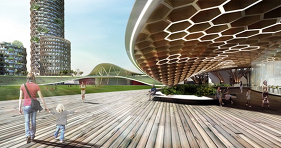 DFA工作室的概念建议包括19个圆筒形的高层建筑,包裹在金色的网状窗框中,并种植植物。这些建筑共有450个居住单元,售价从经适价格到豪华价格。