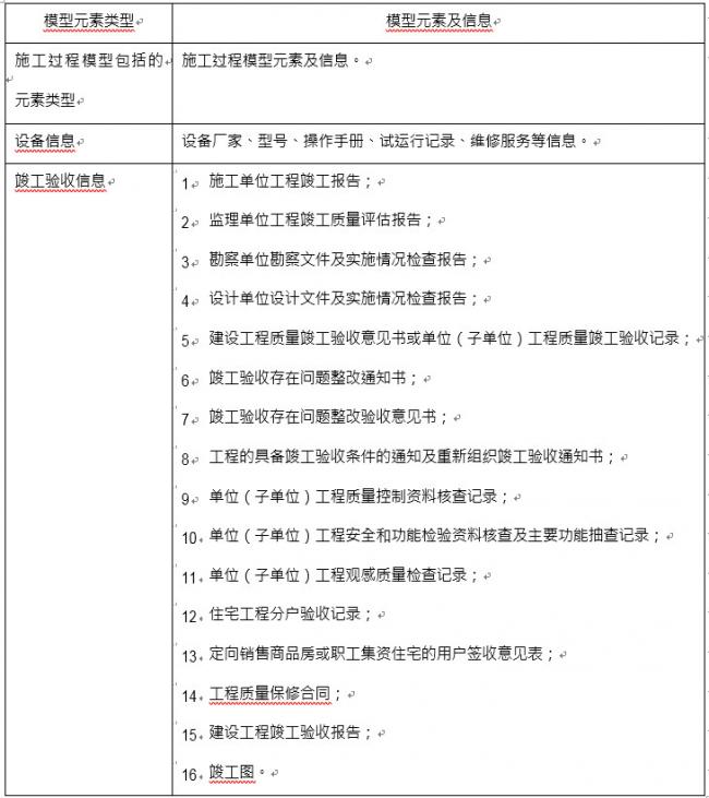1.竣工验收模型除应包括施工过程模型中相关模型元素外,还应附加或关联竣工验收 相关资料,其内容宜符合下表规定。 微信公众号:xuebim 关注建筑行业BIM发展、研究建筑新技术,汇集建筑前沿信息! ← 微信扫一扫,关注我们+