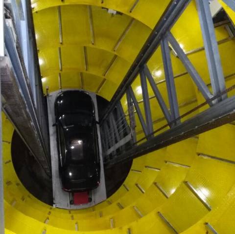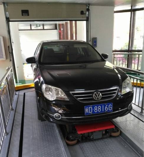 停车时,车辆进入停车门亭,由搬运小车将车辆搬运到沉井中央圆形停车平台上,设备自动旋转向下运输,智能控制定位将车辆停放到地下空余的车位上;取车时,输入车牌号或刷卡,搬运小车将自动行走到相应车位取车,90s左右送达出口处取车室。