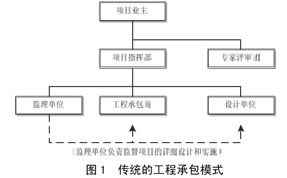 传统的工程承包方式,即业主在完成项目立项、资金落实以后,组织专家评审团招投标;自身成立项目管理指挥部,分别与设计单位签订设计合同,与监理公司签订工程监理合同,与工程承包商签订施工承包合同,承包商在工程监理的质量监督下按设计图纸的要求进行施工,项目指挥部直接参与项目的实施管理,协调设计、施工、监理关系。国内的大多数工程建设项目都是这种模式(如图1所示)。