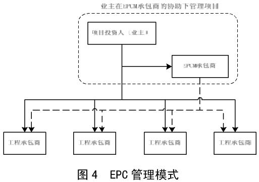即设计(Engineering)、采购(Procurement)、建造(Construction)模式,又被业内称为设计、采购施工总承包,组织形式如图2所示;FIDIC编制的《设计采购施工(EPC)/交钥匙工程合同条件》(银皮书)就是对这一模式的最好诠释和应用;项目投资人与EPC承包商签订EPC合同,EPC承包商负责从项目的设计、采购到施工进行全面的严格管理,在总价固定(Lump-Sum Price)的前提下,投资人基本不参与项目的管理过程,业主重点只在竣工验收、成品交付使用,EPC承包商承担项目建设的大部分风险。