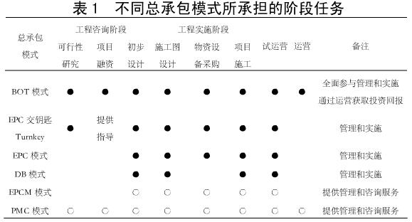 在一体化服务理念的发展下,项目投资人更注重项目成品的接受;承包商在拥有多种资质的前提下,投资人更愿意将不同阶段的任务分派给尽可能少的承包商,以减少管理对象和管理成本。从项目生命周期的角度看,不同类型总承包模式的承担阶段任务的范围对比见表1。