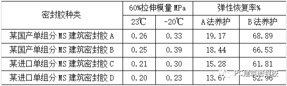单组分MS建筑密封胶的基础聚合物反应活性相对较低,彻底反应完全所需时间相对较长,如果标准给定的养护时间不够,基团反应不彻底,密封胶内部交联程度不够,弹性恢复率表现较低。采用JC/T 881-2001对比4款国内外MS建筑密封胶弹性回复率测试结果可知,按照A法养护,测试结果(见表3)不符合标准要求,采用GB/T 22083-2008对单组分MS建筑密封胶进行分级,最高只能符合该标准中的12.5 P类型产品要求,结果为塑性材料,而实际的MS建筑密封胶为弹性密封胶,明显欠妥;如果按照B法养护,弹性恢复率可达到60%以上,符合GB/T 22083-2008标准中的20LM类型产品要求,测试结果为弹性材料。综上所述,由于现今没有专门针对MS建筑密封胶应用的标准,套用按应用领域或分级界定的标准明显欠妥,使得单组分MS建筑密封胶在建筑市场领域,尤其是PC外墙密封领域推广异常困难。
