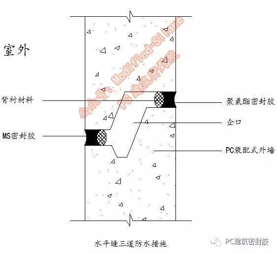 装配式混泥土结构(PC)建筑的外墙渗漏有3个条件:水、缝隙、移动水的力。对于“水”,可通过水路方式尽量避免接近缝隙,如水滴线的设计等;对于“缝隙”,避免因生产质量或运输、施工等因素造成的外墙板开裂;对于“移动水的力”,主要是水自身特性(如:重力、表面张力等)及外部动能(气流、压力差等),可通过设计坡度、滴水线、企口、泛水、等压腔等构造来解决,所以,装配式建筑外墙接缝防水宜采用排水和导水相结合的构造防水结构。